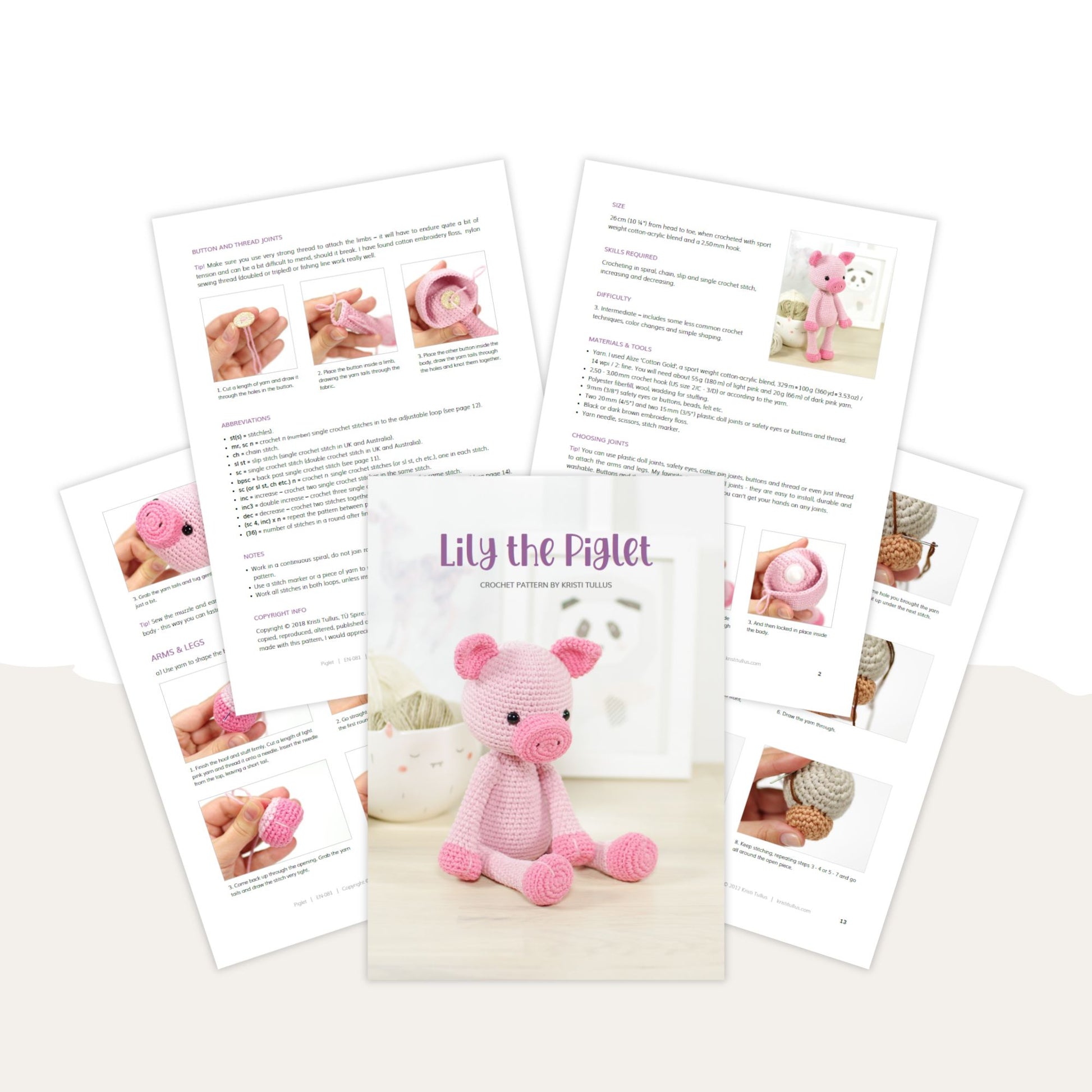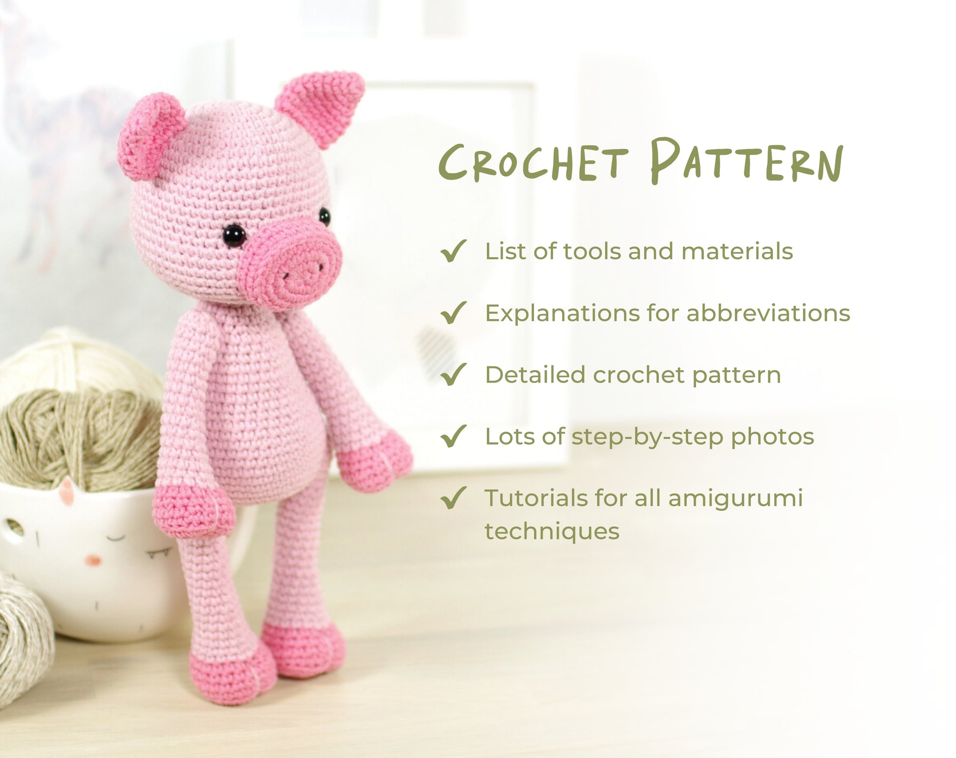 This crochet pattern includes all the instructions needed to make this cute piglet. Arms and legs are attached using doll joints (or buttons and yarn) to make them movable.