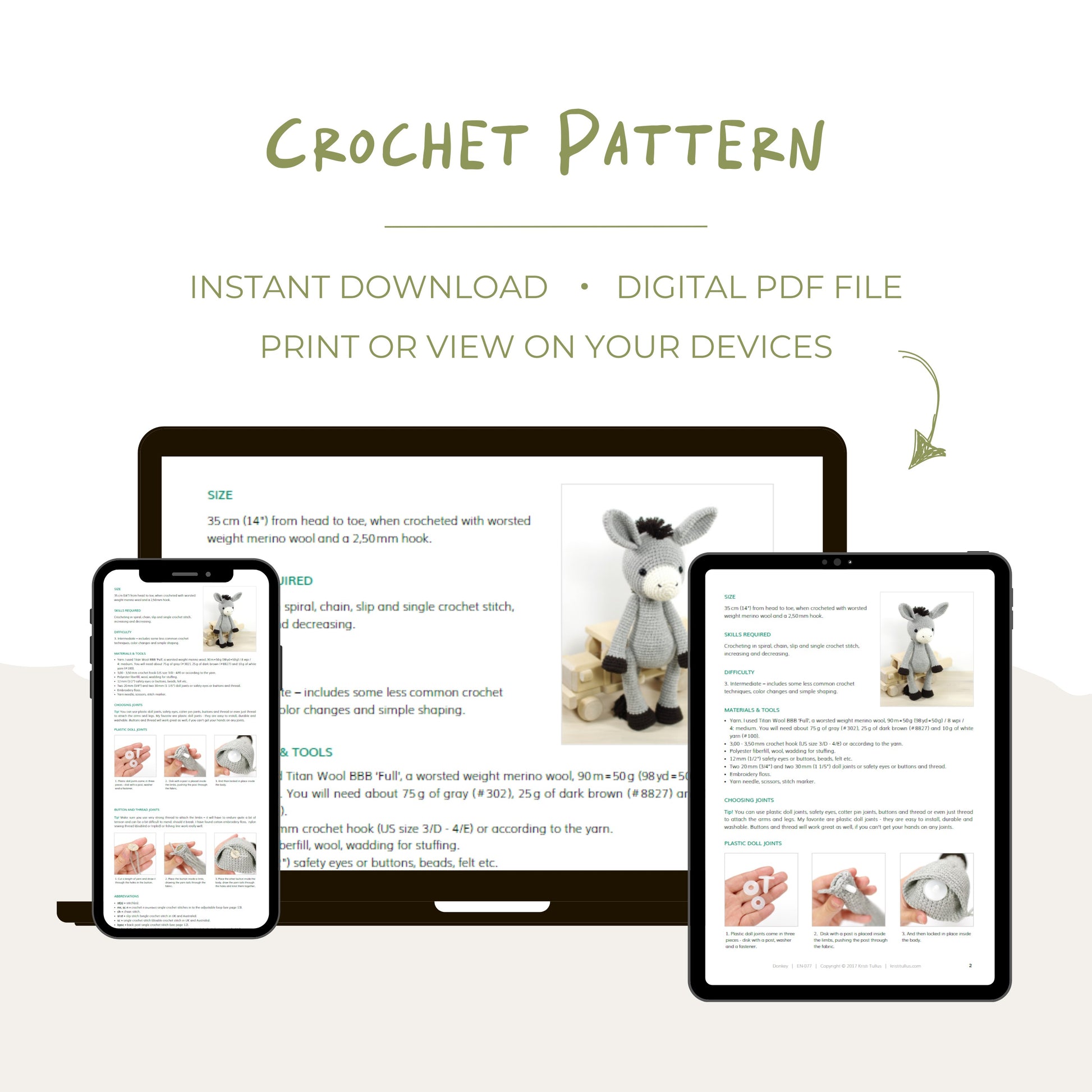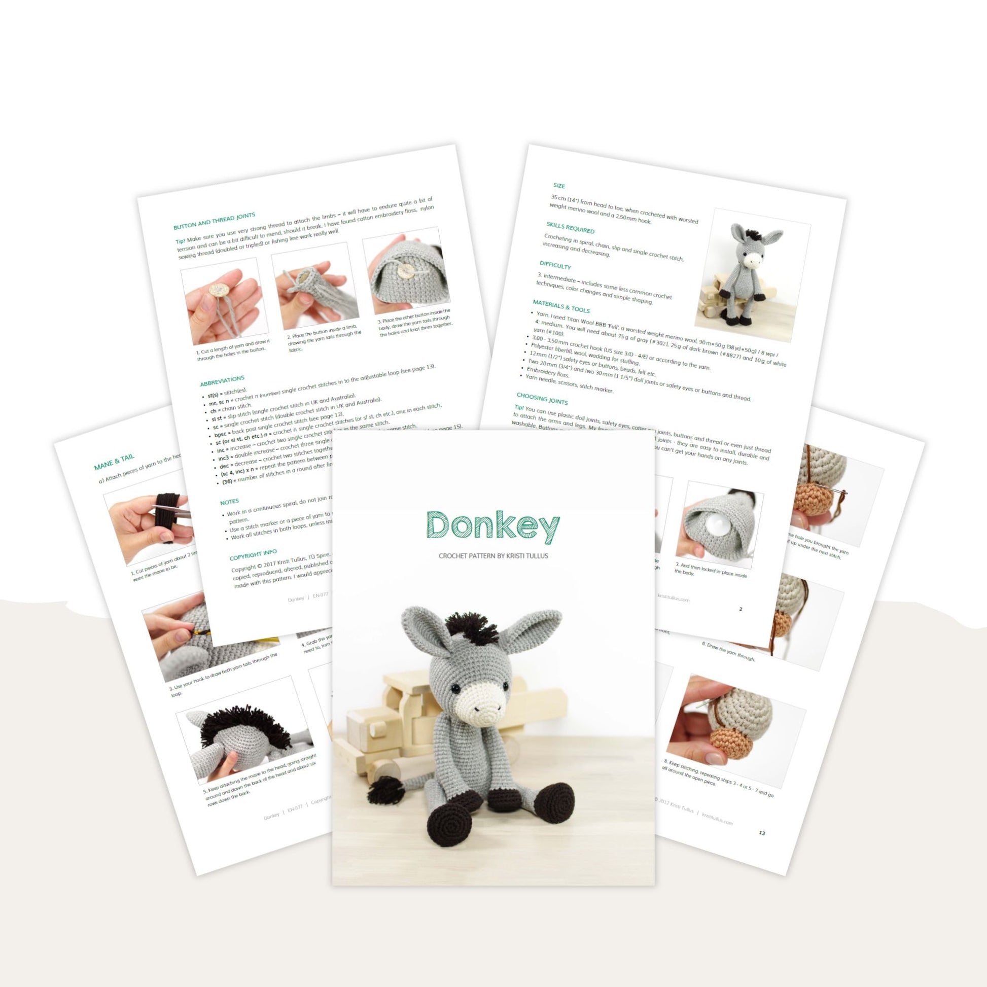 With the help of this written crochet pattern you'll be able to make your own cute donkey. Arms and legs are attached using doll joints (or buttons and yarn) to make them movable.