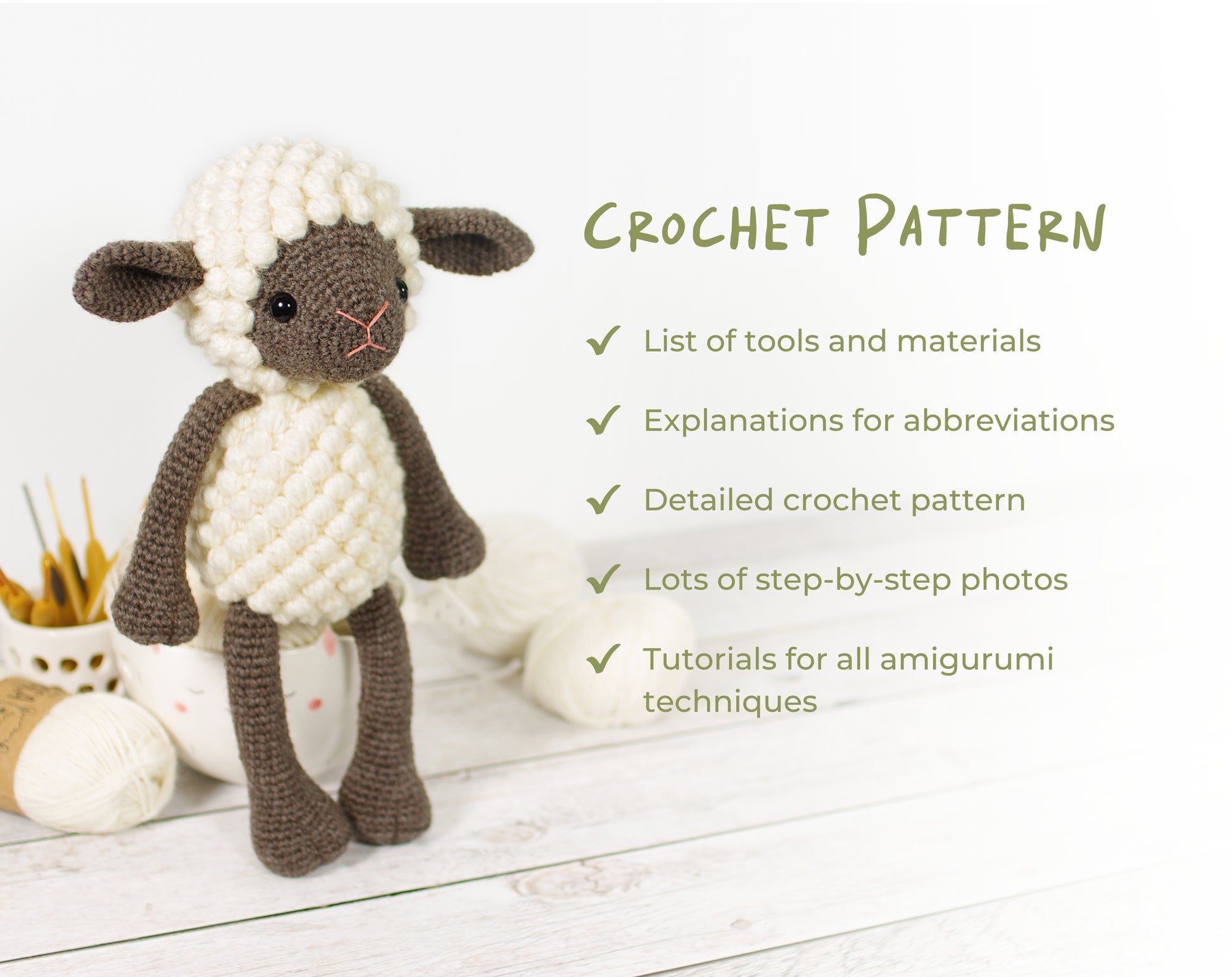 This written crochet pattern includes all the instructions needed to make your own cuddly toy sheep. Detailed instructions, many step-by-step photos and useful tips and tricks will make following the pattern easy for beginner crocheters as well.