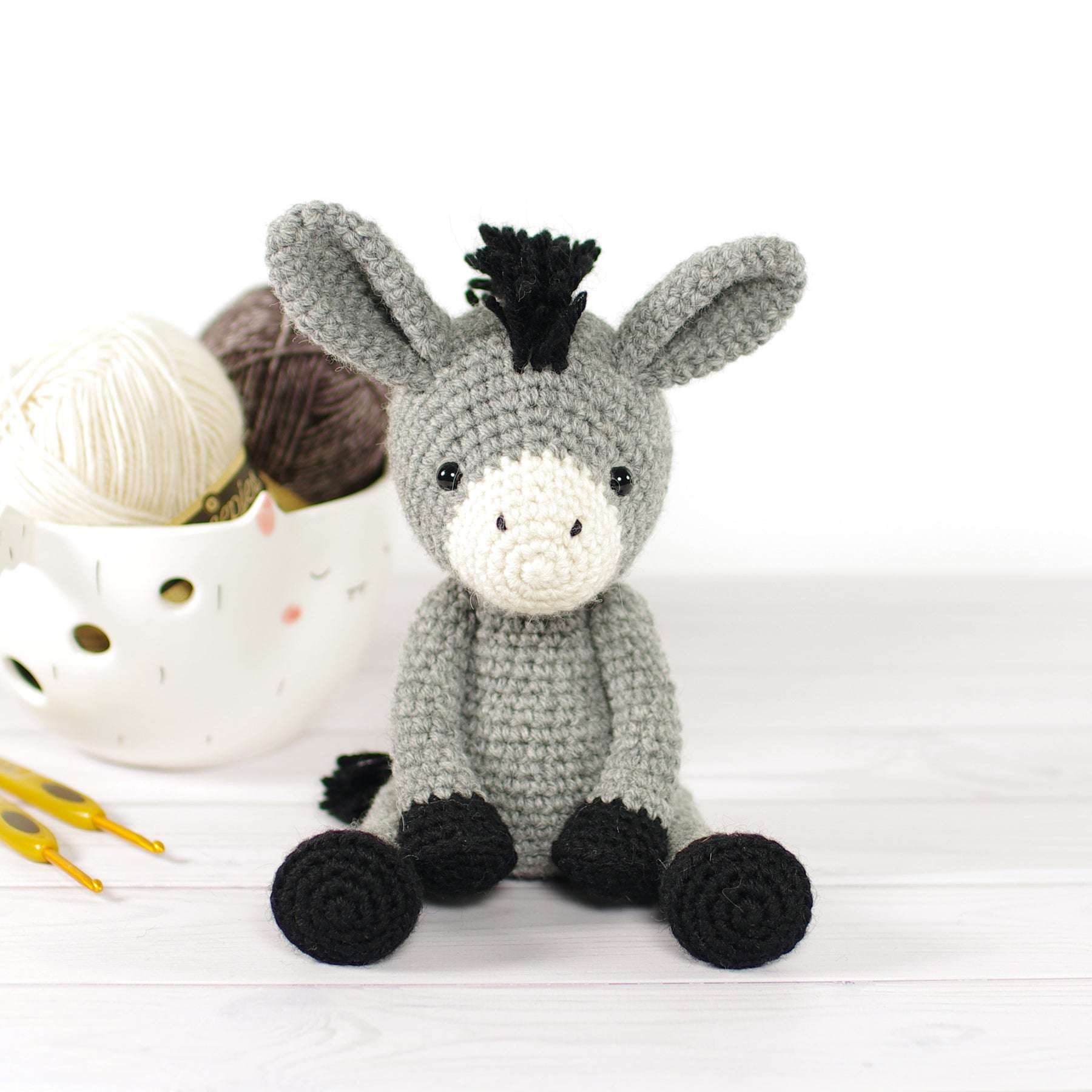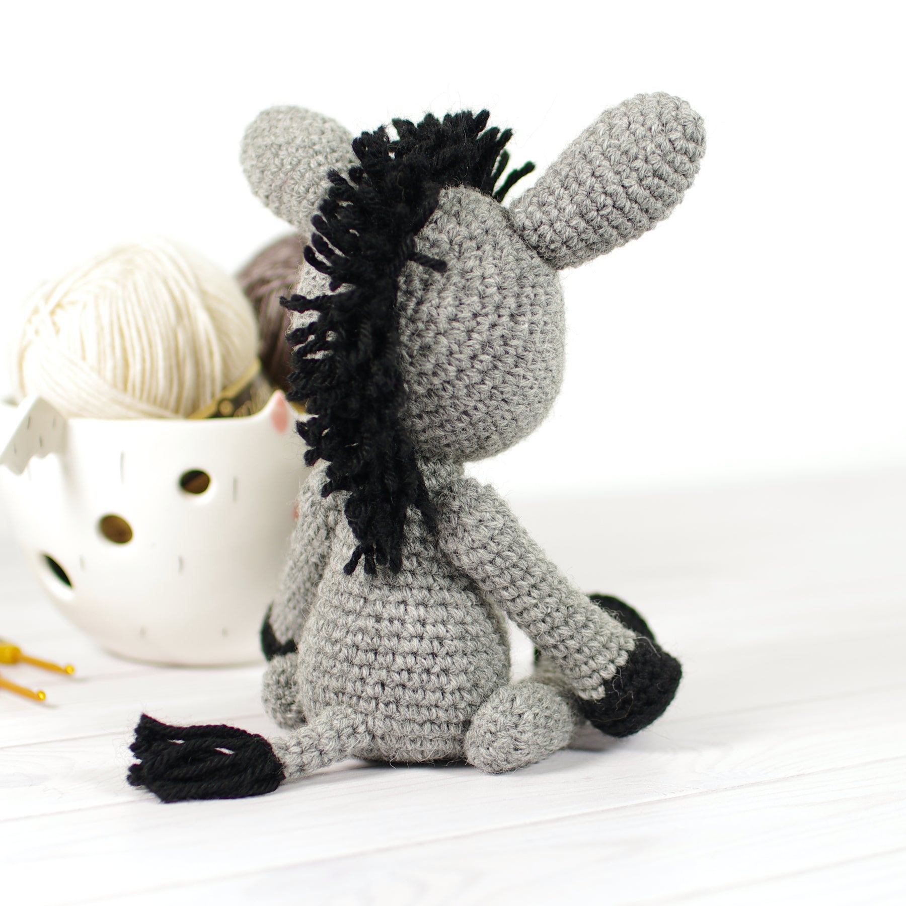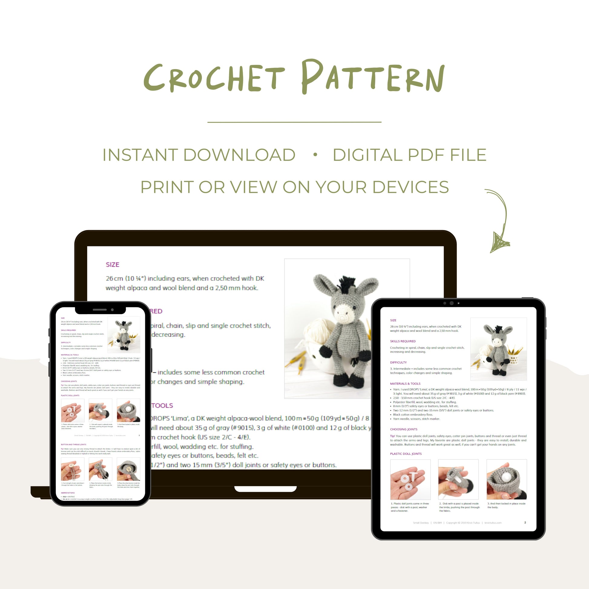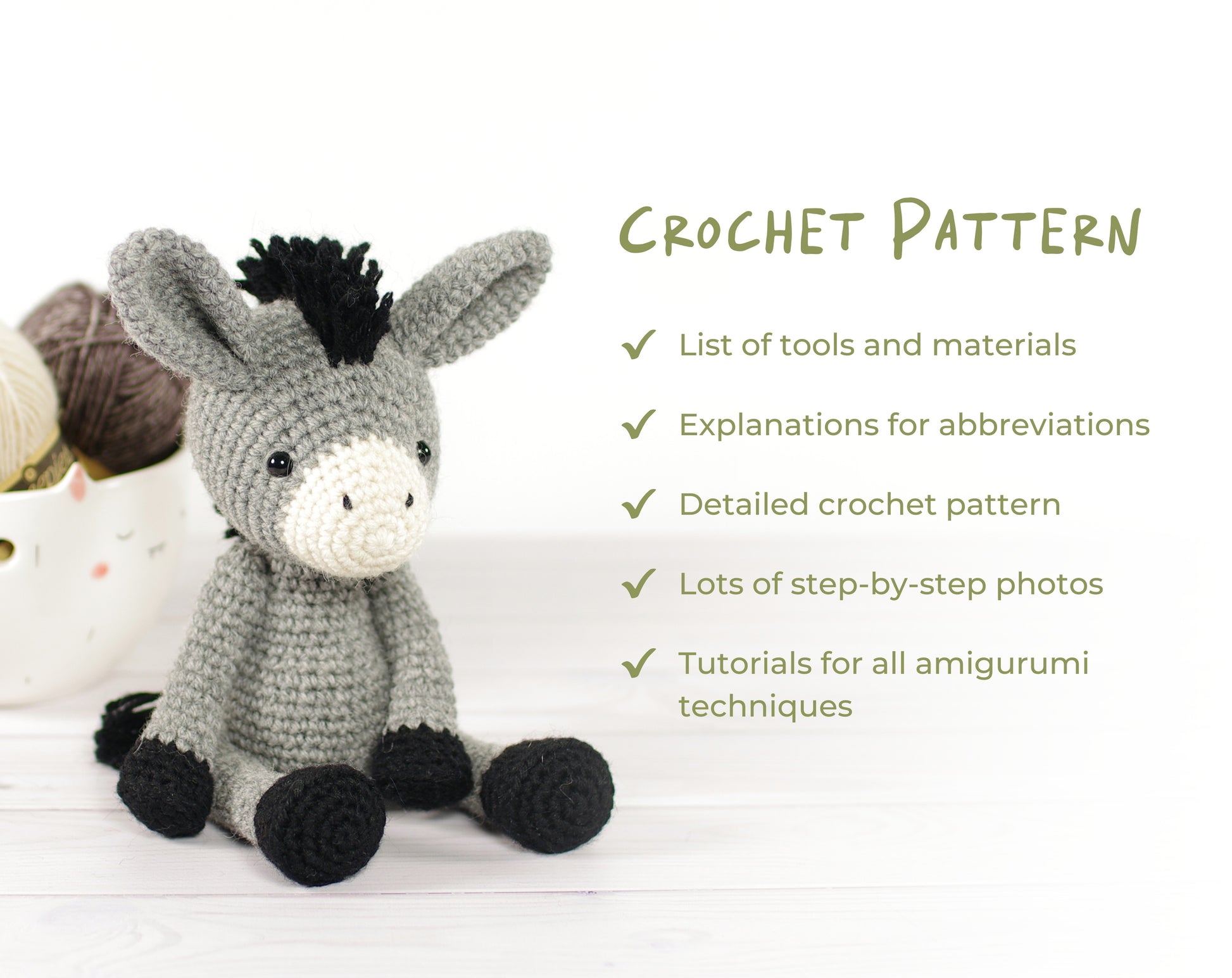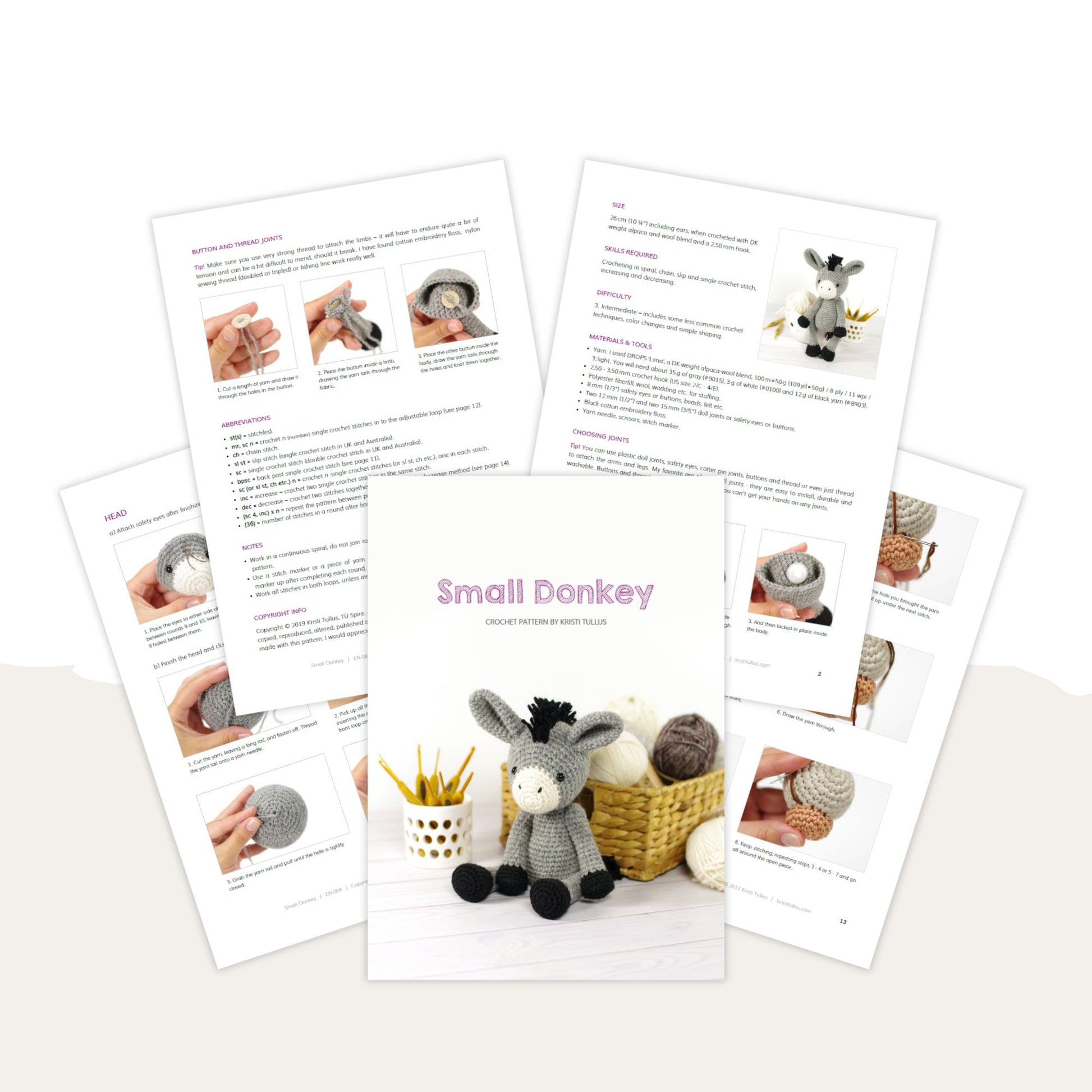 This written crochet pattern includes all the instructions needed to make a cute small donkey. Arms and legs are attached using doll joints (or buttons and yarn) to make them movable.
